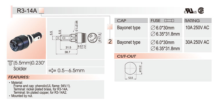 6*30面板安裝保險絲座 R3-14A UL CSA 30A250V