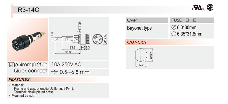 6*30面板安裝保險絲座 R3-14C UL CSA 10A250V