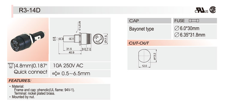 6*30面板安裝保險絲座 R3-14D UL CSA 10A250V