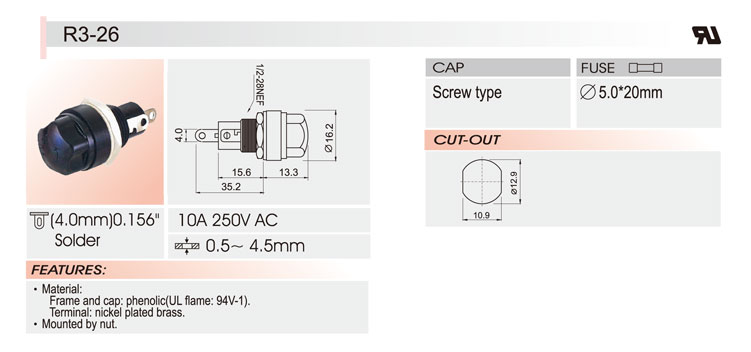 5*20 面板安裝保險(xiǎn)絲座 R3-26 UL CSA 10A250V