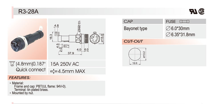 6*30 面板安裝保險絲座 R3-28A UL CSA 15A250V