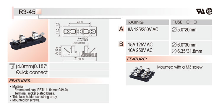 5*20/6*30 PCB安裝保險絲座 R3-45 UL CSA 15A250V