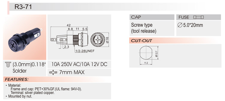 5*20面板安裝保險(xiǎn)絲座 R3-71 10A250V
