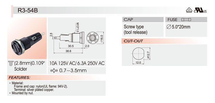 5*20面板安裝保險絲座 R3-54B VDE UR CSA 10A250V