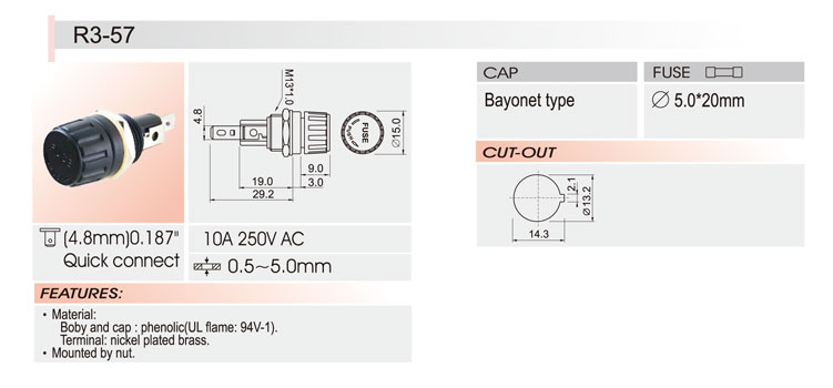 5*20面板安裝保險絲座 R3-57 UL CSA 10A250V