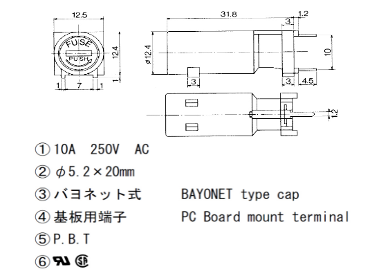 5*20 PCB板安裝保險(xiǎn)絲座 MF-561 UL CSA 10A250V